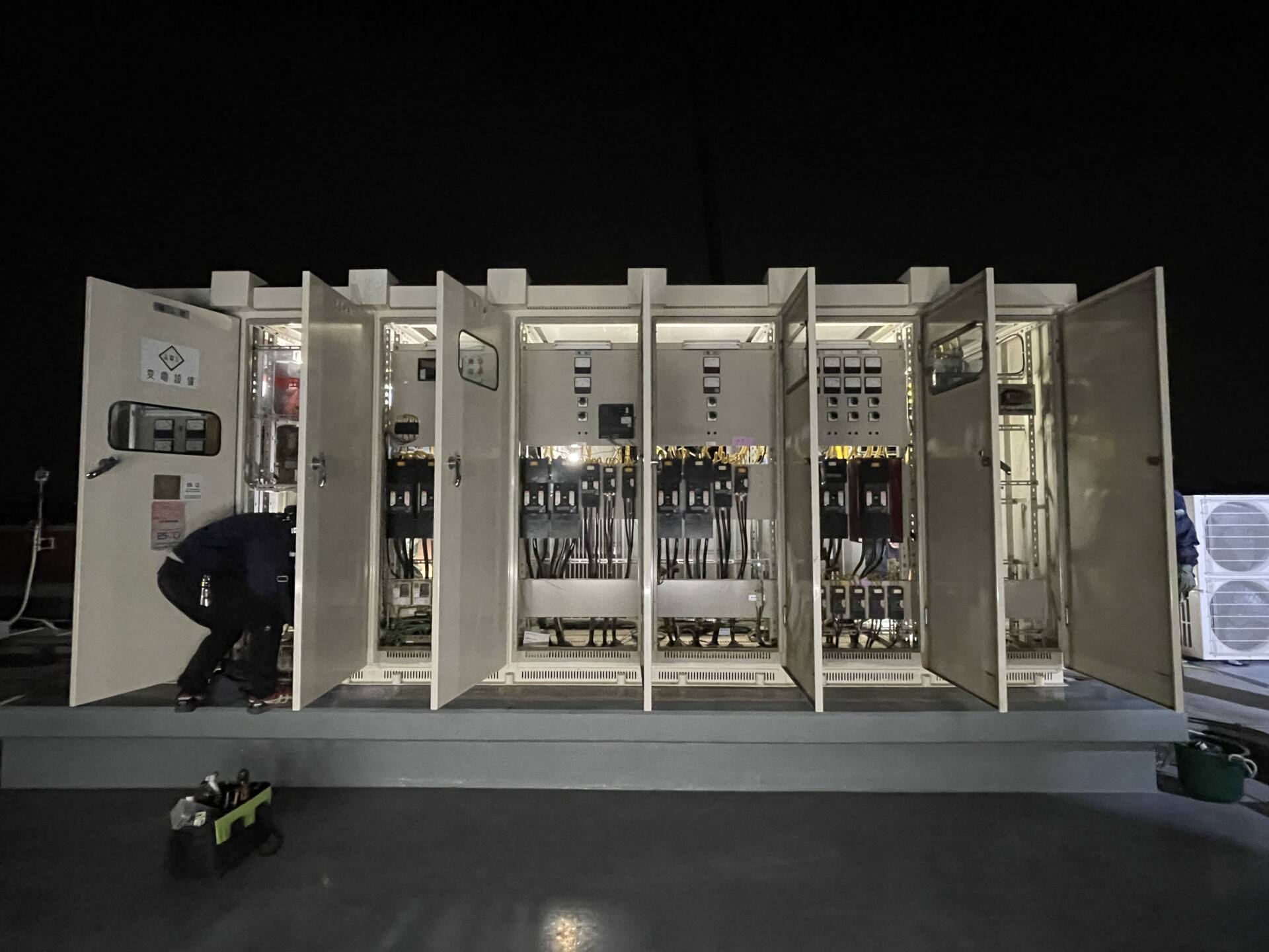 今回の施工事例は、地元のホームセンターにある7面の高圧受電盤(キュービクル)内の機器すべてと高圧幹線の更新工事。店舗に通常営業をしてもらうために、4回に分けて深夜に工事をする大掛かりな工事。そして、何よりも危険が伴う工事なので、しっかりと工事前MTG行ってから作業に入ります!!